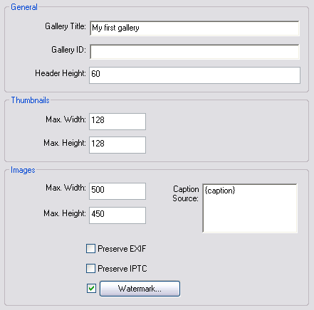 If you want to show image descriptions you can set the Caption Source field here. The value "{caption}" as shown in the screen shot will be replaced by the content of the IPTC caption field of each image during the HTML generation process. Leave this field empty if you don't want to show additional information.