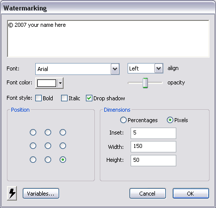 Adding a Watermark to your images is a very good way to protect them. Embed your name and/or website in the image for a visual reference. Below you can see a setting that gives a nice result.